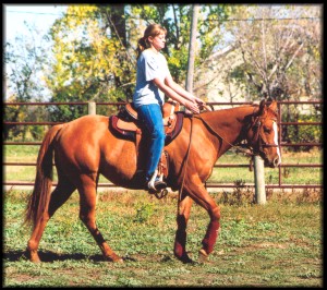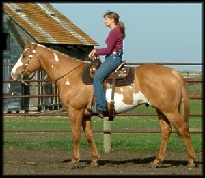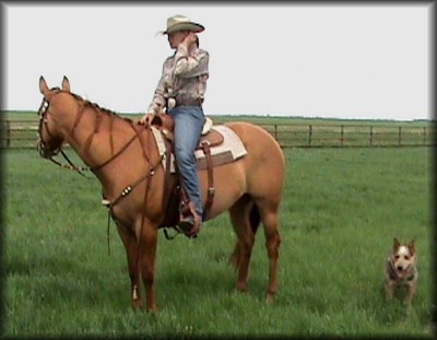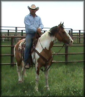 Taking a break. Randy on Beau, Erin on Ria (sired by Baron Sugar) Beau (Paycheck Fever), is the sire of Patrice Zimmerman's good barrel horse, Bedouino Ever Lassie (Fidele).