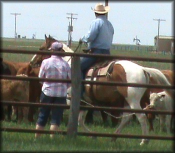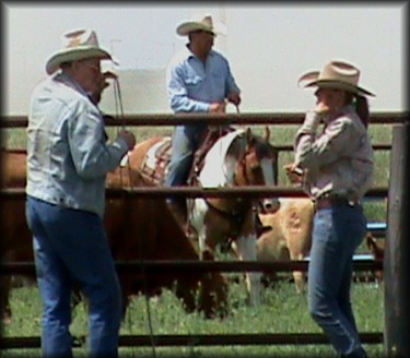 'Papa Joe' Jacob and Erin, talkin' a little philosophy, while Margo and Randy sort cattle. ![]()
