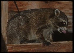 Our 'mighty' Tucker, treed (so to speak) this poor racoon, up in our verandah. |